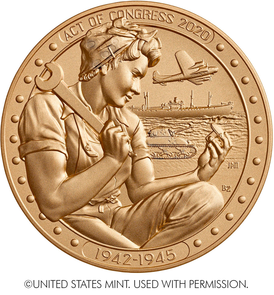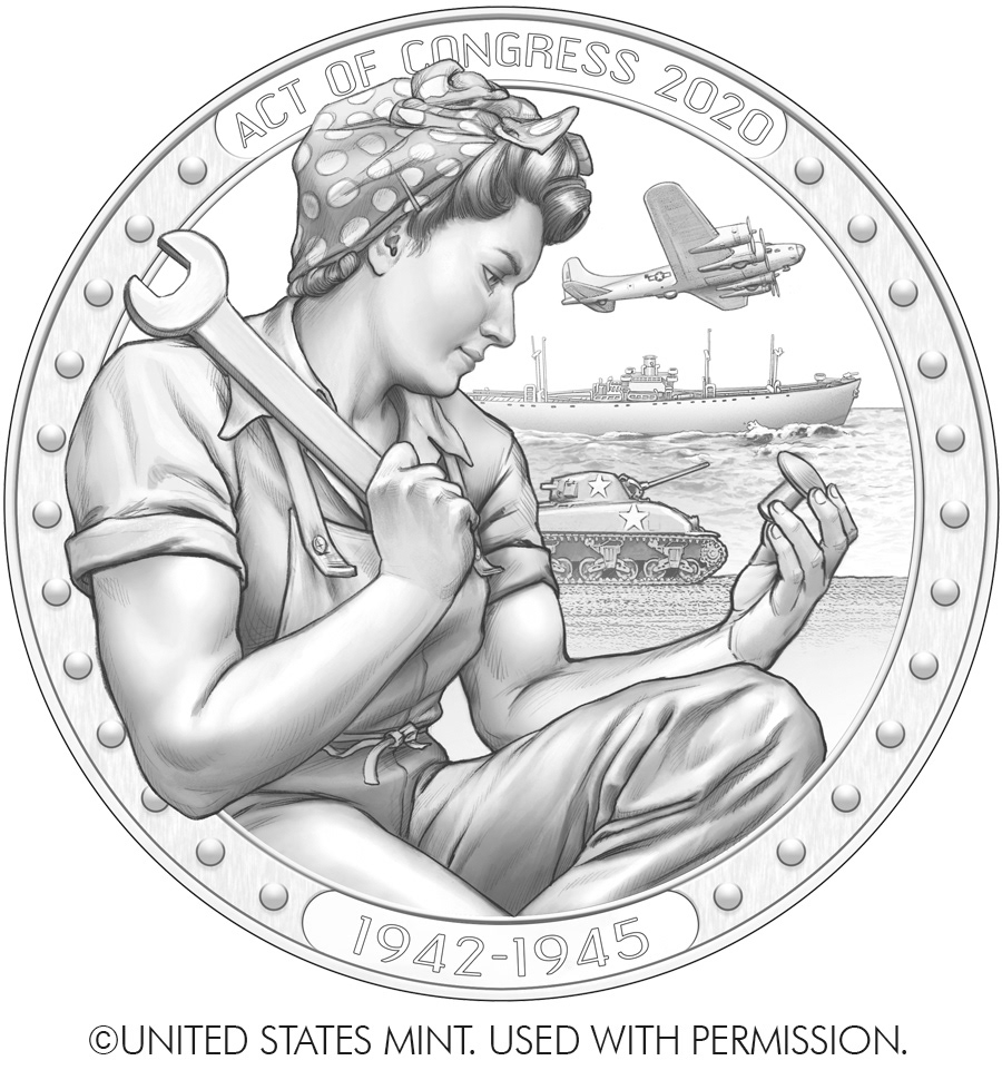 The reverse features a Rosie with a wrench casually resting on her shoulder and a rivet in her other hand. A Liberty ship and M4 tank travel behind her, and a B-17 bomber flies above, representing the variety of equipment built by Rosies. A ring of rivets frames the design with windows featuring the inscriptions “ACT OF CONGRESS 2020” and “1942-1945.
