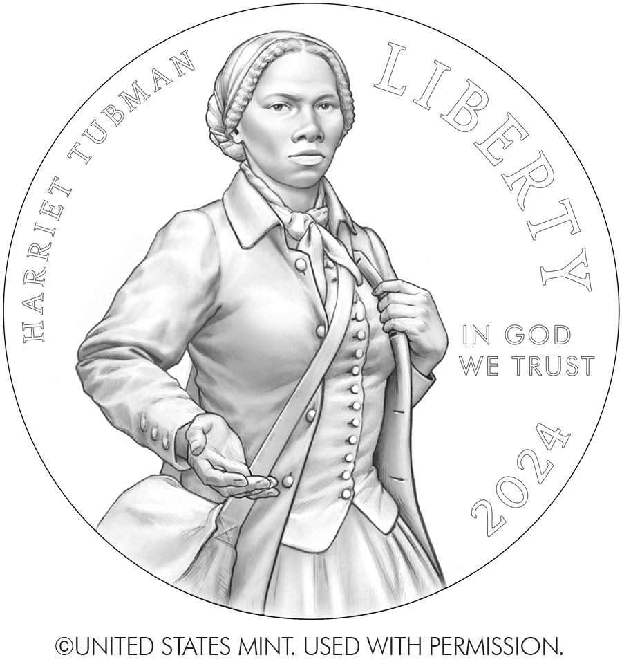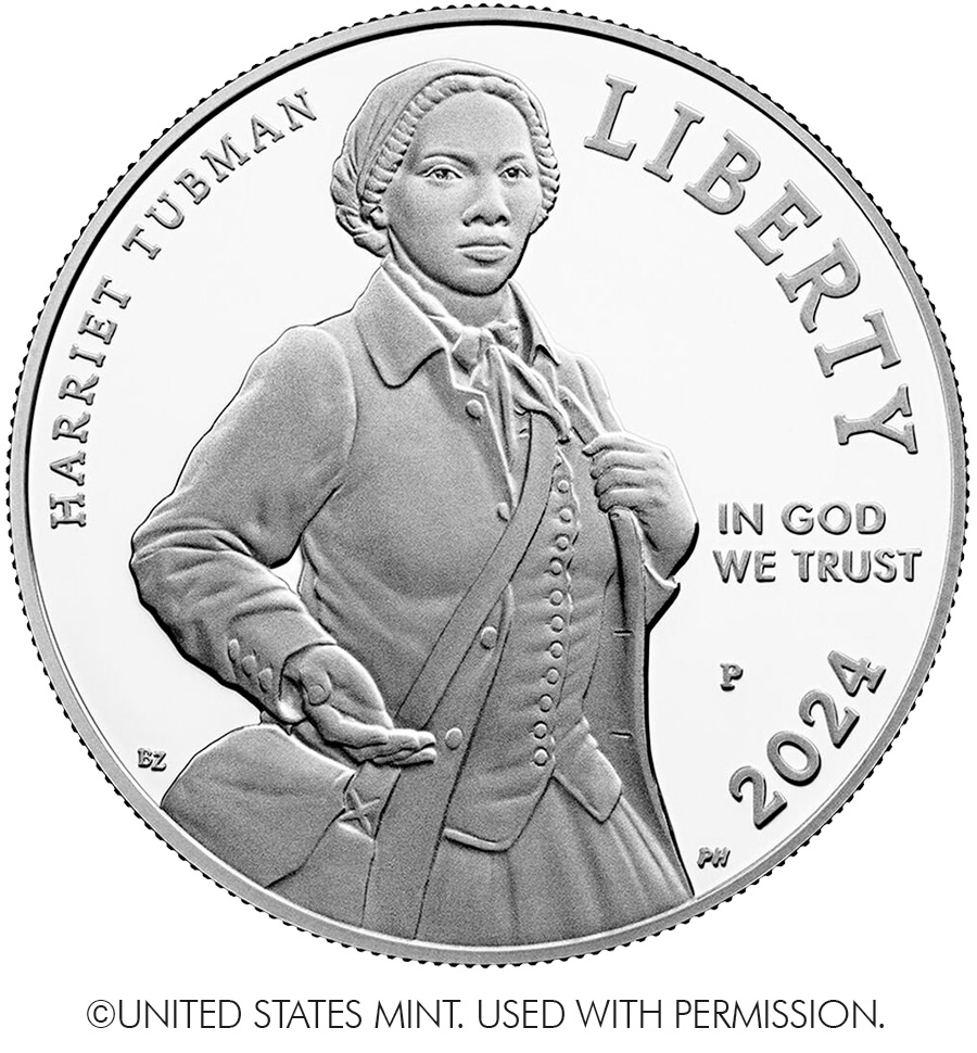 The obverse (heads) depicts Harriet Tubman offering her hand to the viewer with an expression that challenges the viewer to seize the opportunity for freedom.