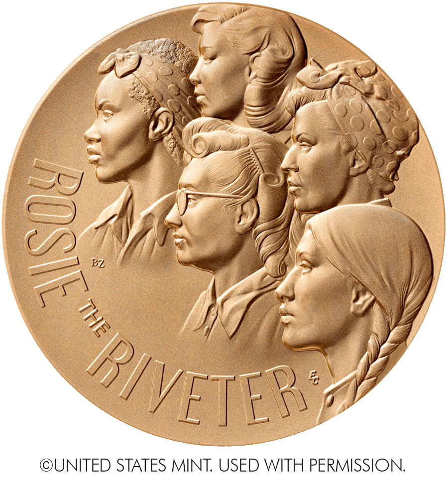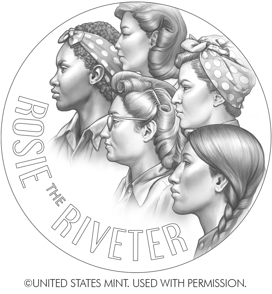 The obverse design features five Rosies in profile to represent the diversity of women in the war effort. The inscription is “ROSIE THE RIVETER.”