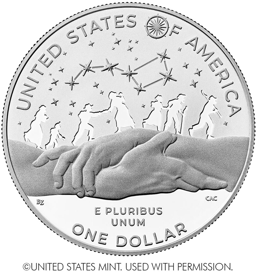 The reverse (tails) depicts silhouettes crossing a bridge created by a pair of clasped hands. In the sky, the Big Dipper constellation points to the North Star, which forms the “O” in the word “OF.”