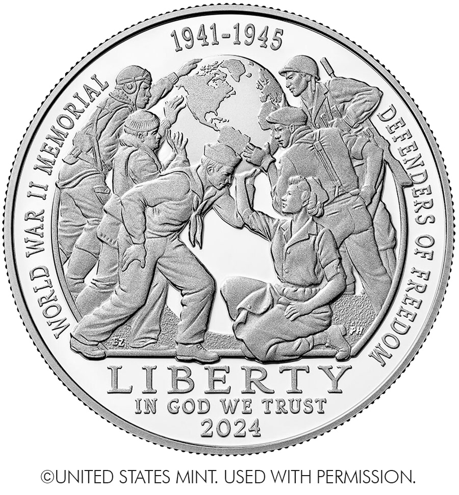 The U.S. Mint released the Greatest Generation Silver Dollar as part of the Greatest Generation Commemorative Coin Program. The Mint struck $5 gold coins, $1 silver coins, and clad half dollars as part of the program. The designs are emblematic of the National World War II Memorial and the service and sacrifice of American soldiers and civilians during World War II.