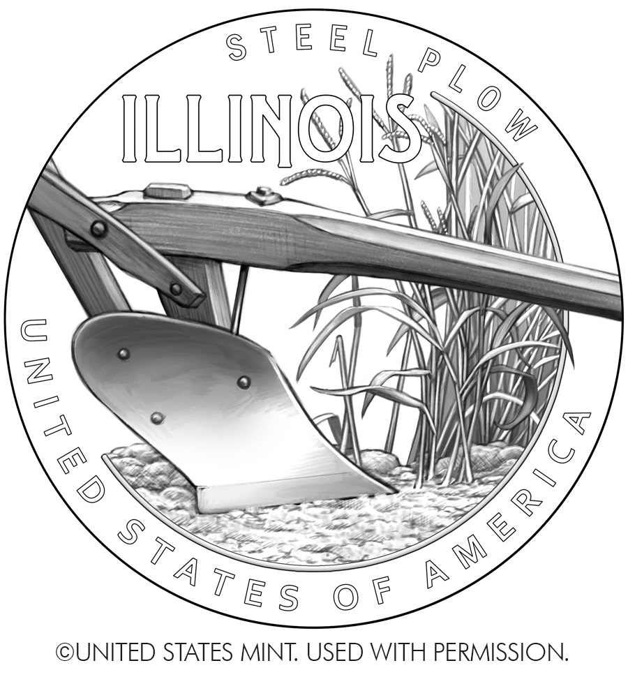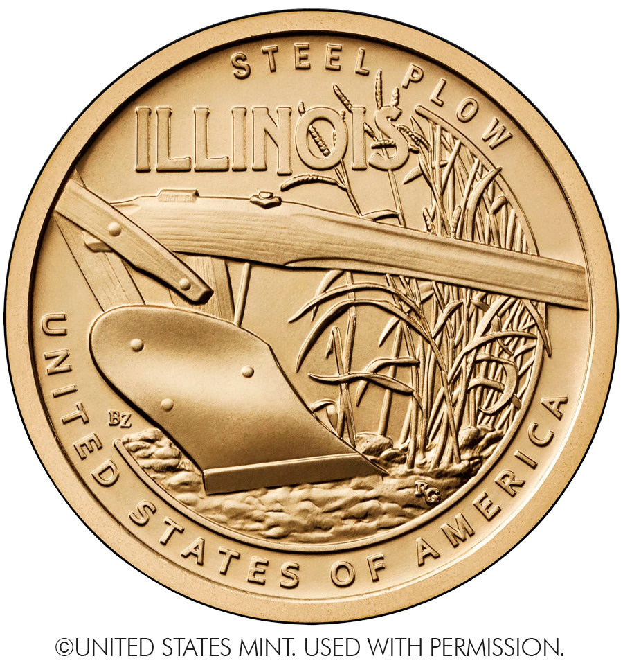 The American Innovation $1 Coin representing Illinois recognizes the First Steel Plow. The coin reverse (tails) design features a large steel plow blade affixed to a right-handed beam and braces. Behind the plow is a stand of Big Bluestem prairie grass and a field of soil below.
