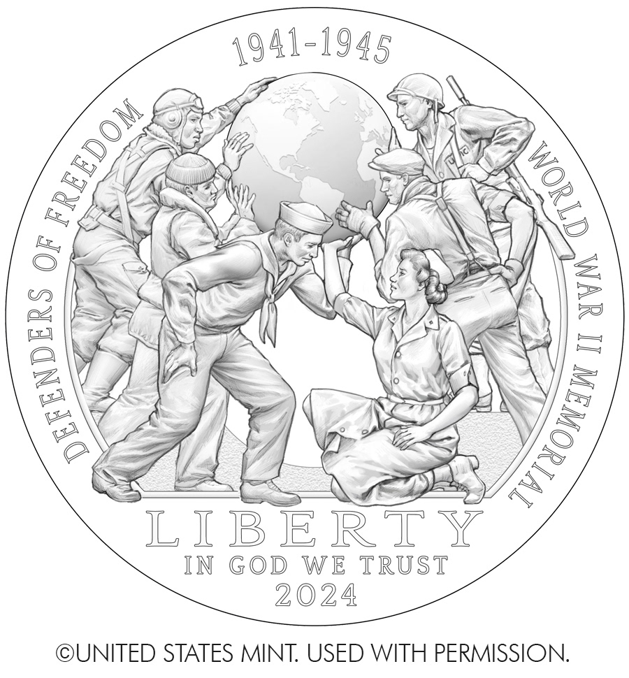 The obverse (heads) features six figures working together to support the Earth, illustrating the cooperation of each of the military branches (Army Air Forces, Coast Guard, Navy, Army, and Marine Corps), as well as the Merchant Marine during World War II.