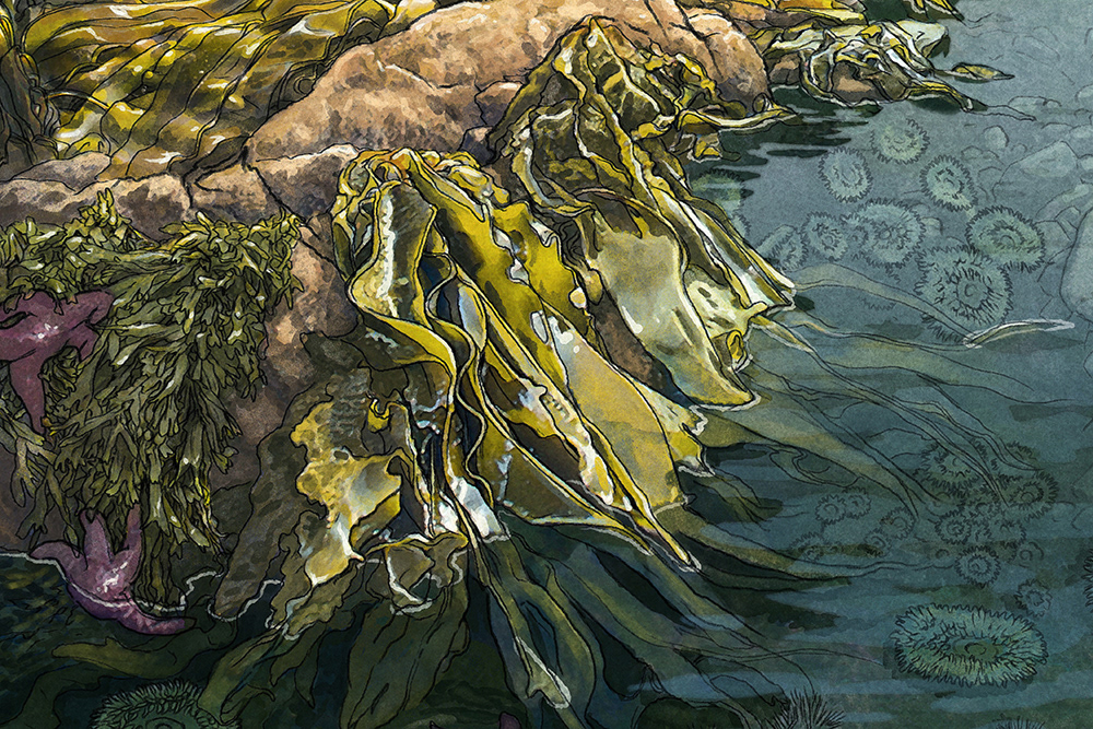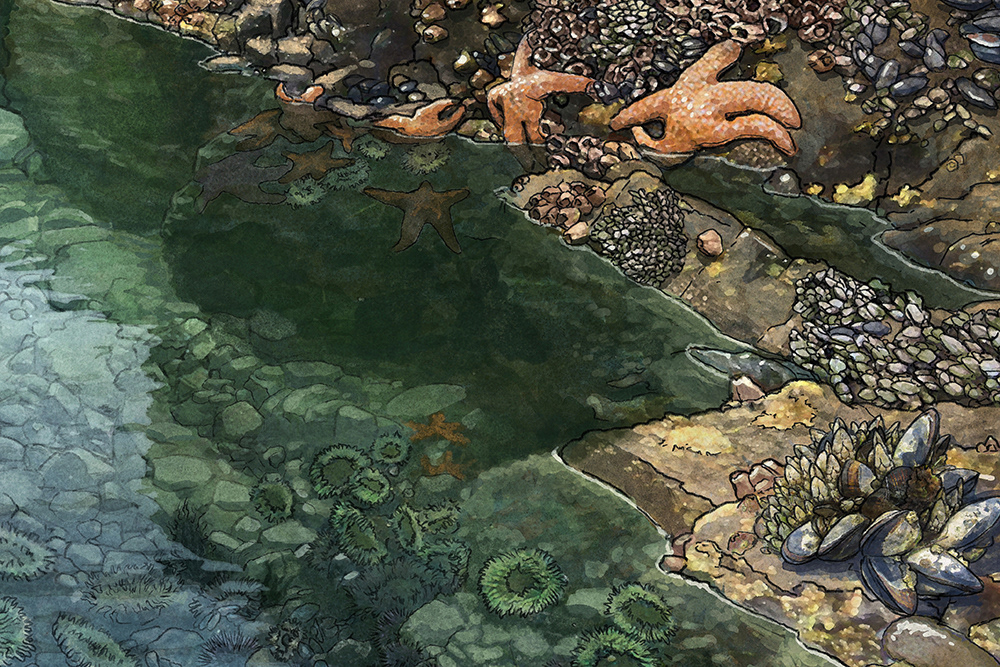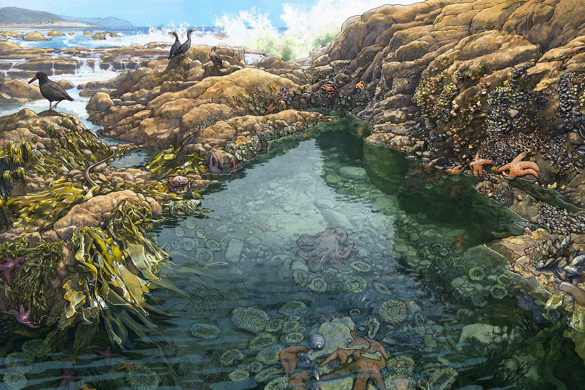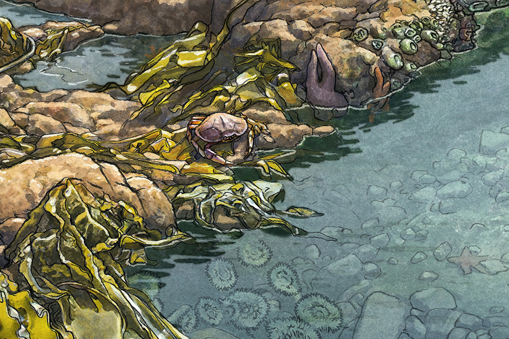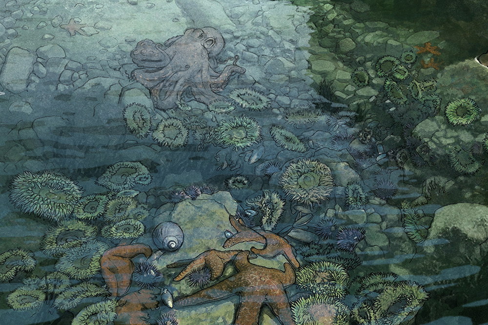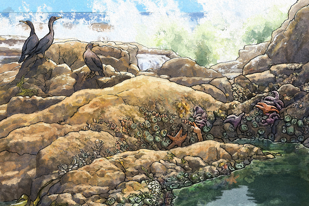 I illustrated large, digital-watercolor habitat illustrations for the new signage at the Minnesota Zoo's Discovery Bay. Both panels show a complex ecosystem with plants, birds, fish, invertebrates and mammal species unique and endemic to each habitat. This Tidepool illustration features a rocky Pacific-Northwest shoreline with iconic Oregon-coast wildlife, including green and aggregating anemone, hermit and shore crabs, ochre seastar, purple sea urchin, pacific octopus, oystercatcher and cormorants, acorn and goosneck barnacle, as well as rockweed, sea palm and bull kelp. (©Beth Zaiken)
