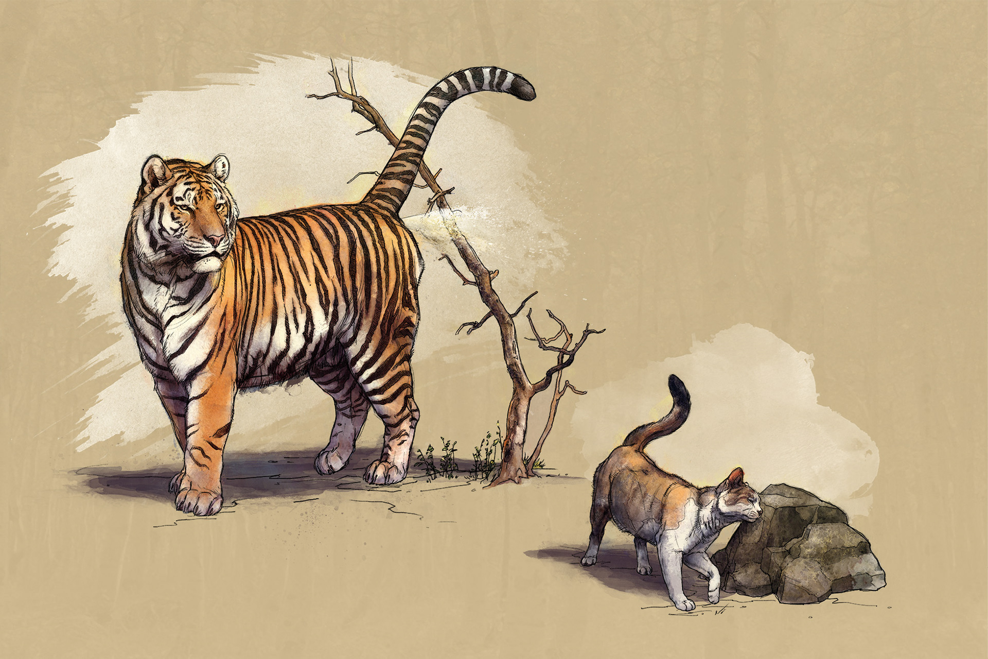 Adult tiger spray-marking a tree with urine, juxtaposed with a domestic cat scent marking from glands on it's head